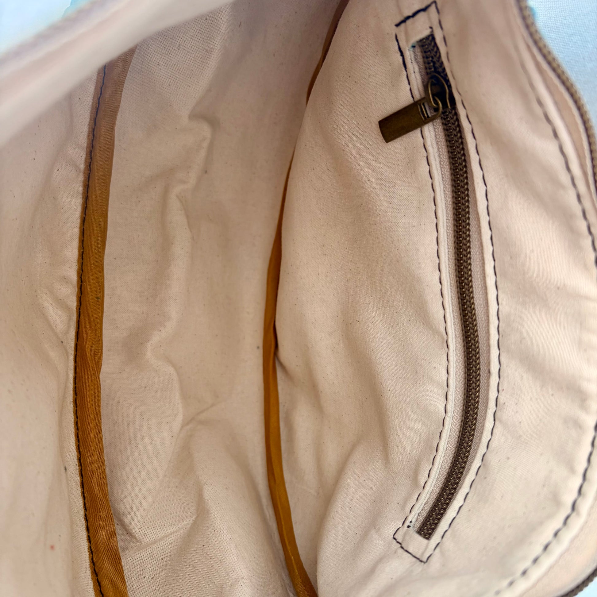 L’extérieur du sac est en corduroy bleu sarcelle avec le logo Dix-neuf en liège brun pâle. L’intérieur est beige naturel avec une finition jaune. L’ouverture du zipper principal est de 14 pouces tandis que celui de la poche intérieure mesure 6 pouces.