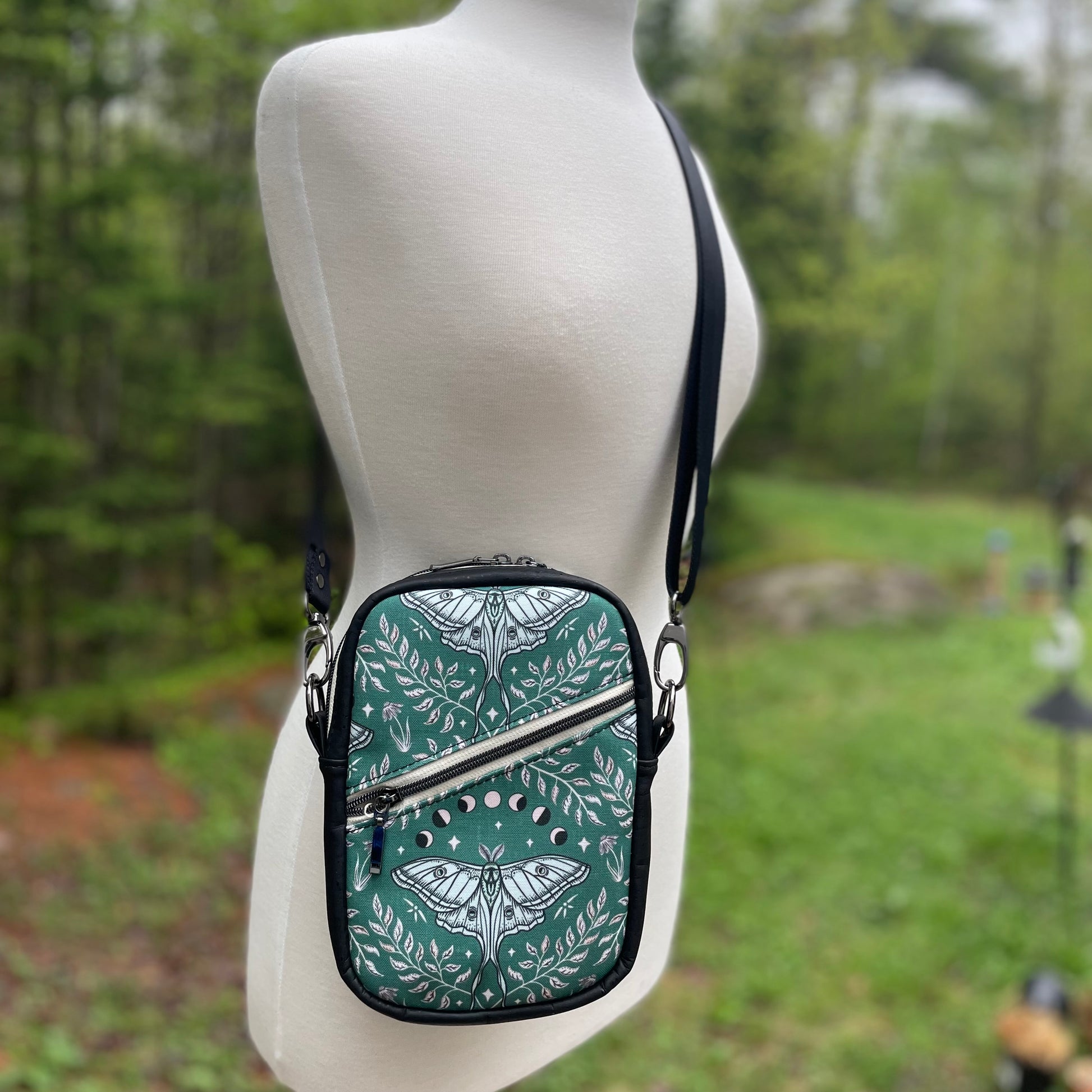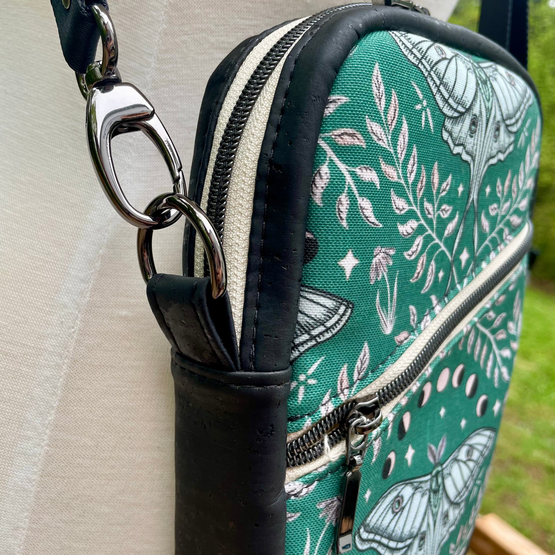 Sac bandoulière en liège noir au devant en canevas vert à motif de papillons noirs et beiges