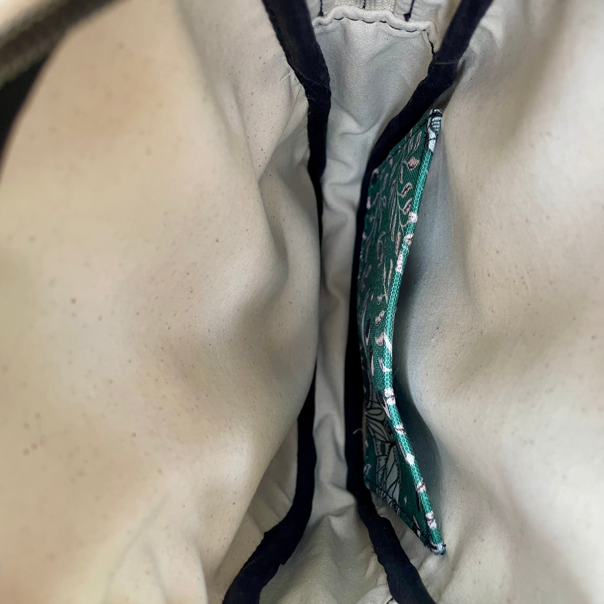 L’extérieur du sac est en canevas vertà motifs de papillons noirs. Le reste du sac est en liège noir. L’intérieur est beige naturel avec une finition noire. L’ouverture du zipper principal est de 12 1/2 pouces tandis que celui de la poche avant mesure 6 1/2 pouces.