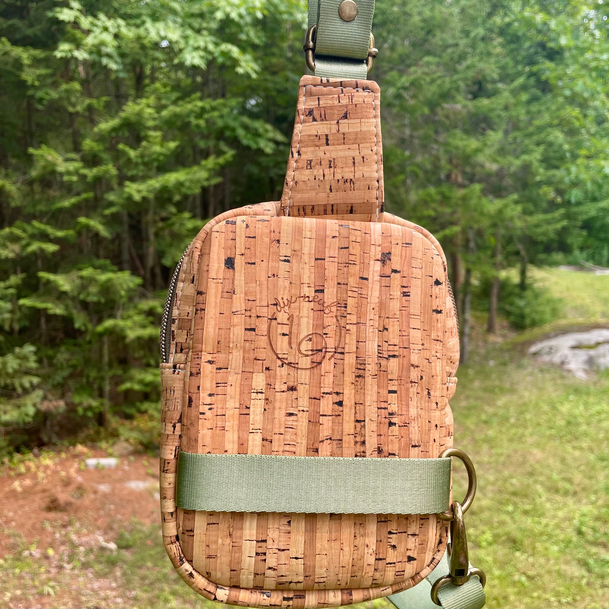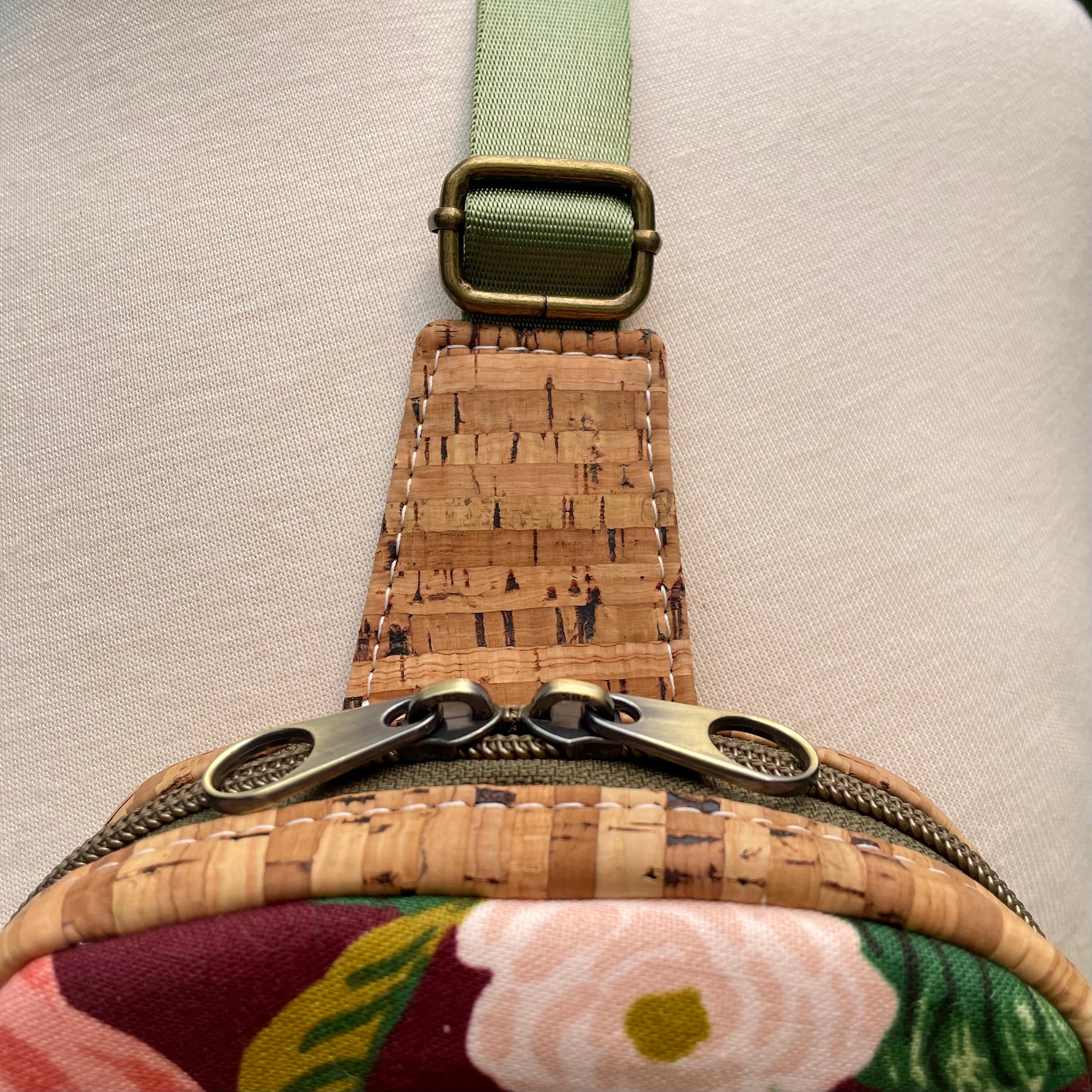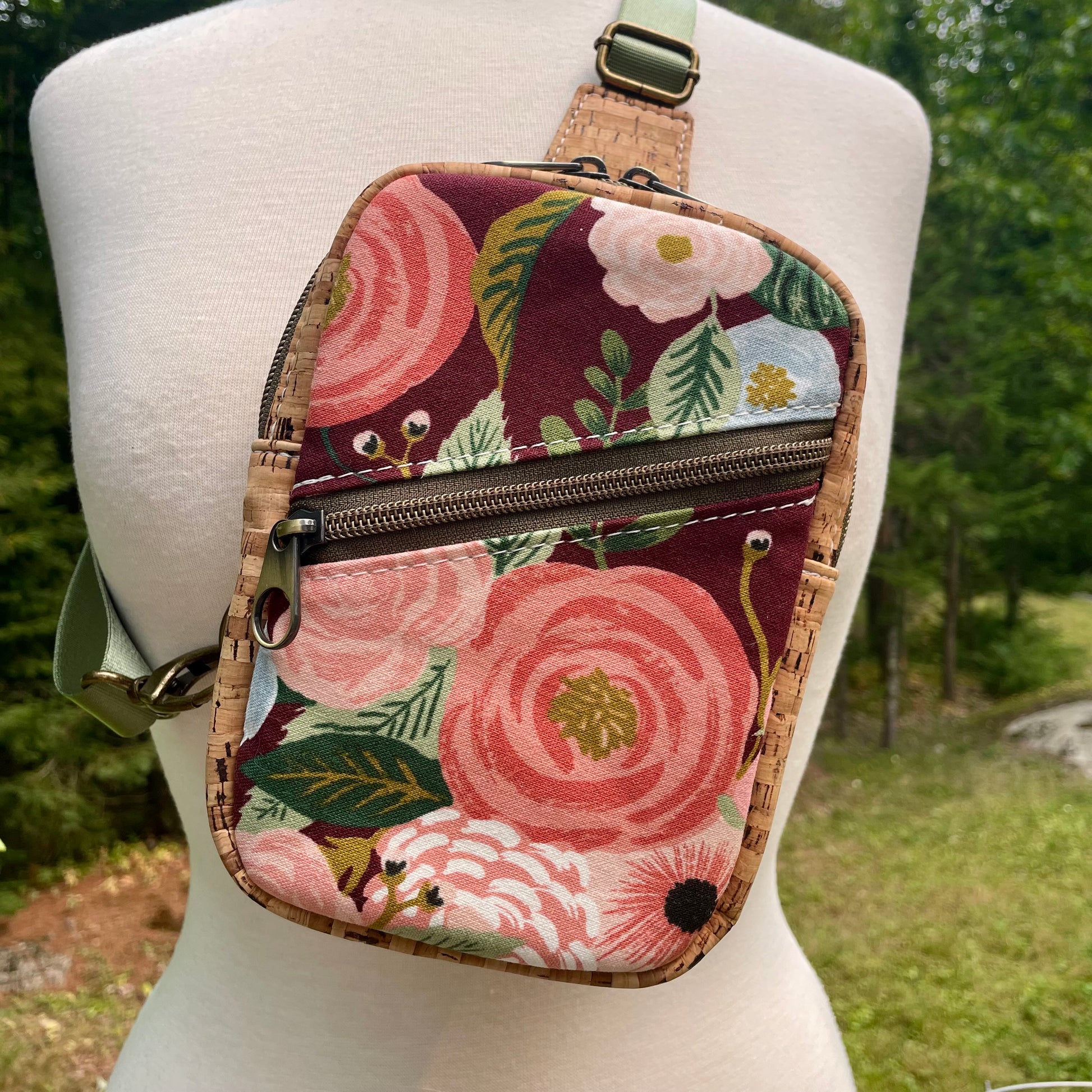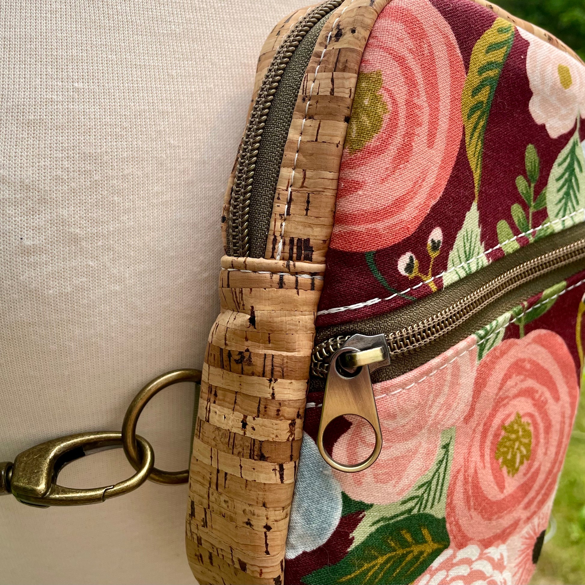 Sac de corps en liège naturel au devant en canevas bourgogne à motifs de fleurs