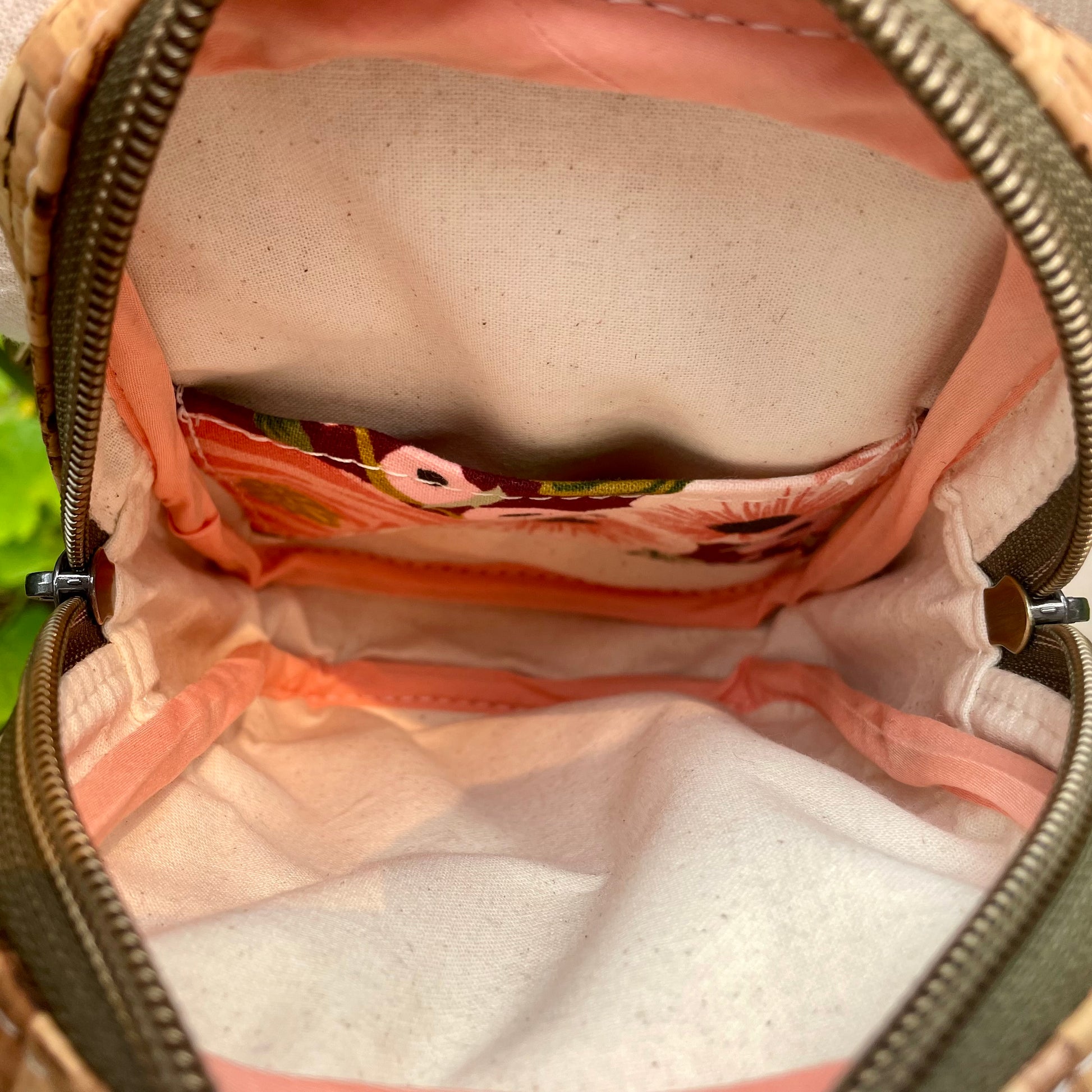 L’extérieur du sac est en canevas bourgogne à motifs de fleurs. Le reste du sac est en liège naturel. L’intérieur est beige naturel avec une finition rose. L’ouverture du zipper principal est de 10 1/2 pouces tandis que celui de la poche avant mesure 5 1/2 pouces.