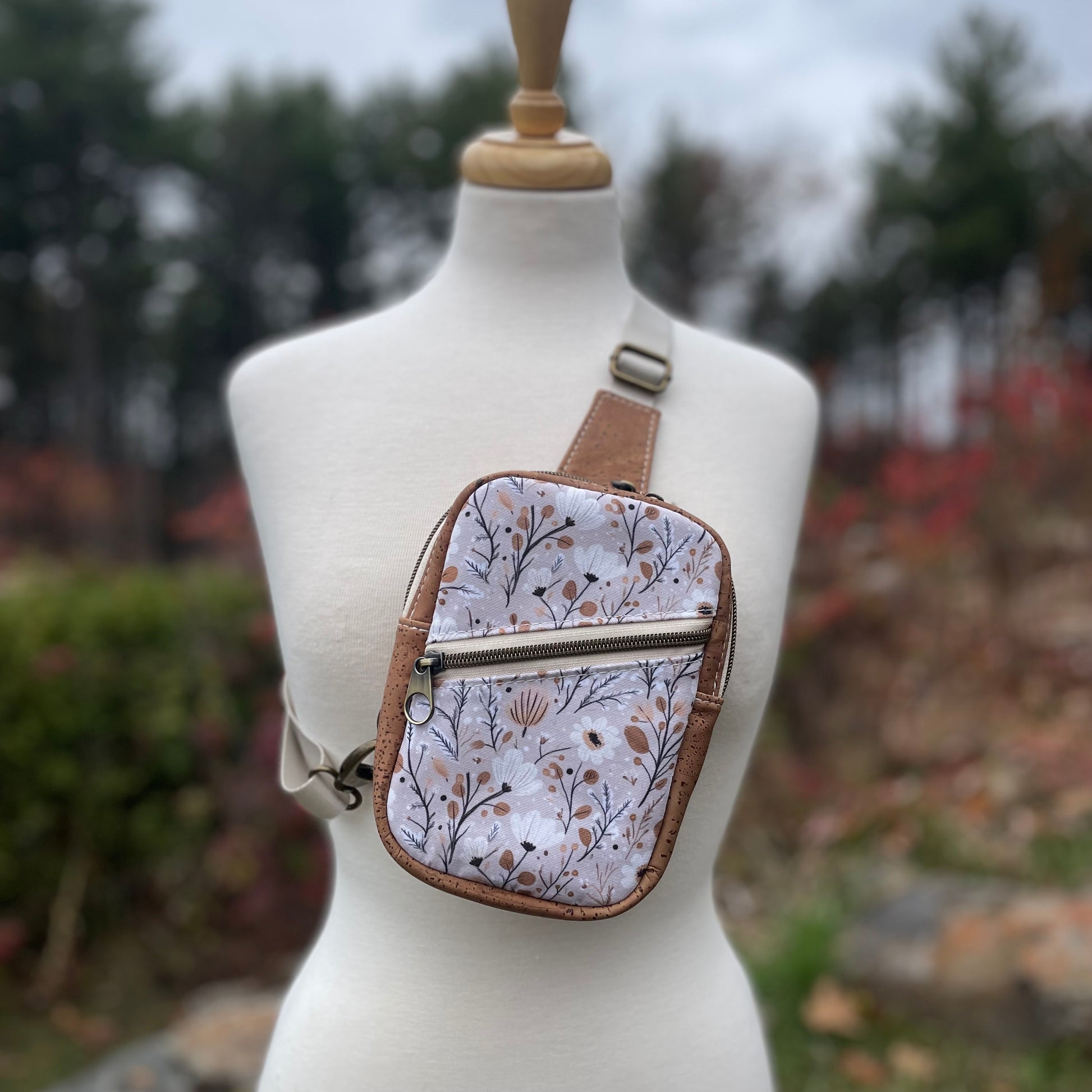 Sac de corps en liège brun pâle au devant en canevas beige à motifs de fleurs
